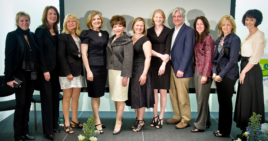 Pictured left to right: screenwriter Elizabeth Sarnoff (honoree), actor Robin Weigert, California Poet Laureate Carol Muske-Dukes, screenwriter Robin Swicord (presenter), Lynda Resnick (honoree), WriteGirl Executive Director Keren Taylor, novelist Marisa Silver (honoree), L.A. Times Book Editor David Ulin (presenter), poet Patricia Seyburn (honoree), screenwriter Nancy Meyers (honoree), and screenwriter and WriteGirl volunteer Clare Sera (emcee).